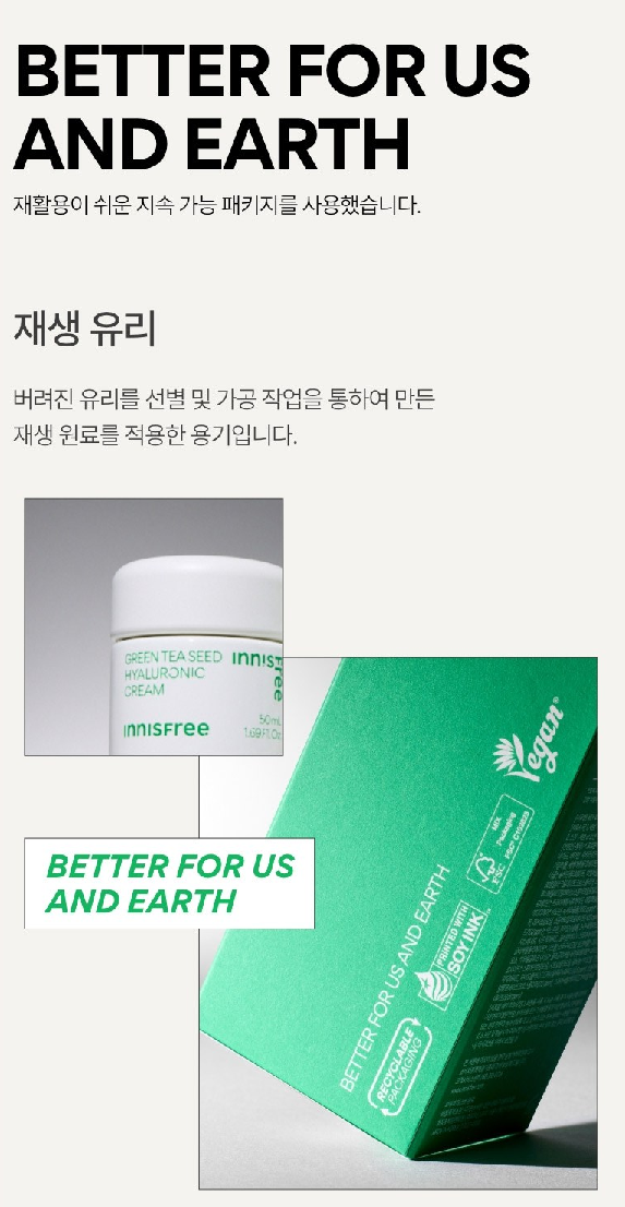 재활용이 쉬운 지속 가능 패키지를 사용했어요. 버려진 유리를 선별 및 가공 작업을 통하여 만든 재생 원료를 적용한 용기랍니다.