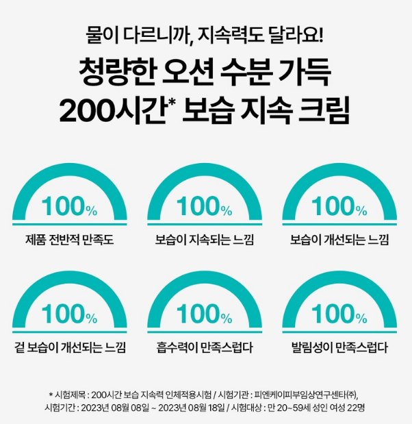 200시간 보습 지속 크림이라 불리는 이유는 200시간 보습 지속력 인체적용시험에서 6가지 항목에 100% 만족 응답을 받았기 때문이에요!