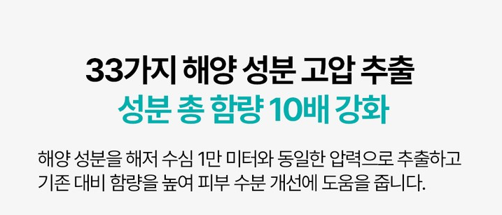 해양 성분을 해저 수심 1만 미터와 동일한 압력으로 추출하고 기존 대비 함량을 10배 높여 피부 수분 개선에 도움을 줘요.