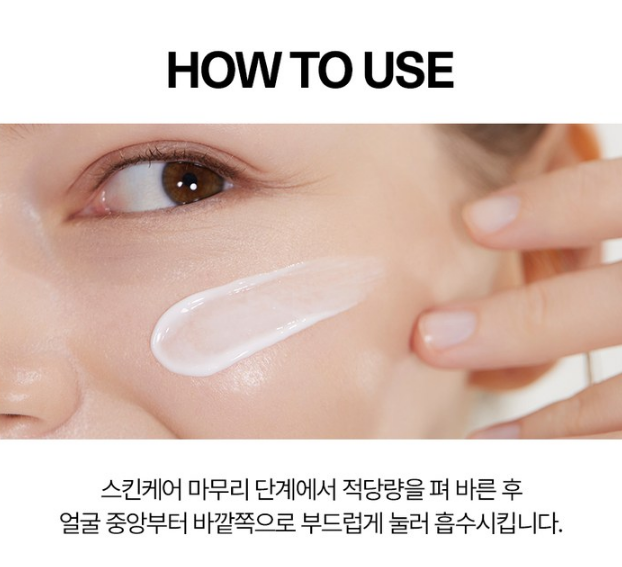 스킨케어 마무리 단계에서 적당량을 펴 바른 후 얼굴 중앙부터 바깥쪽으로 부드럽게 눌러 흡수시켜요.