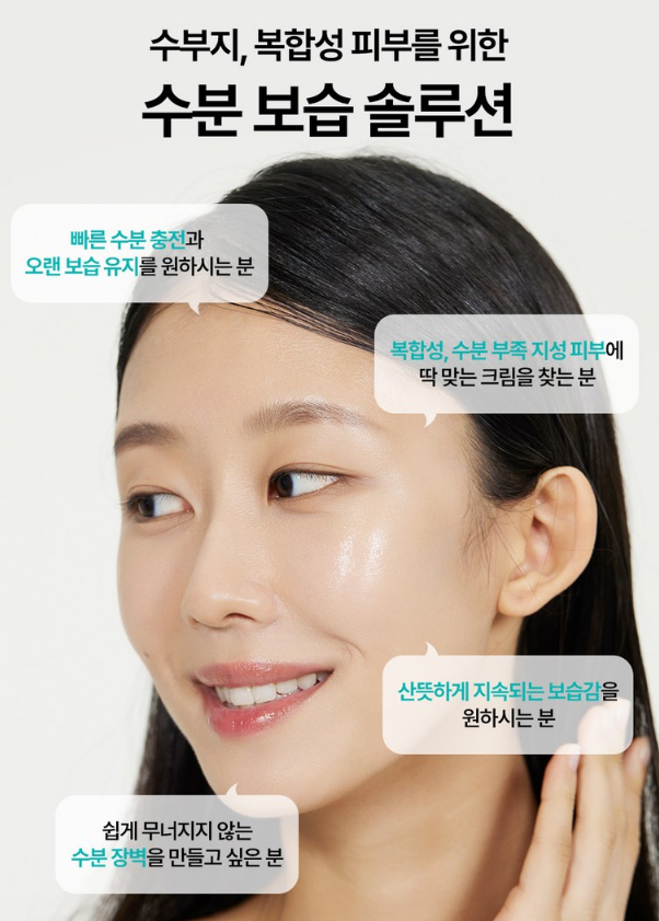 빠른 수분 충전과 오랜 보습 유지를 원하시는 분, 복합성, 수분 부족 지성 피부에 딱 맞는 크림을 찾는 분, 산뜻하게 지속되는 보습감을 원하시는 분, 쉽게 무너지지 않는 수분 장벽을 만들고 싶은 분에게 추천하는 제품이에요.