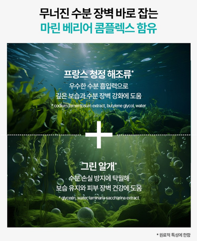 프랑스 청정 해조류의 우수한 수분 흡입력으로 깊은 보습과 수분 장벽 강화에 도움을 줘요. 그린 알개 성분이 수분 손실 방지에 탁월해 보습 유지와 피부 장벽 건강에도 도움을 준답니다.