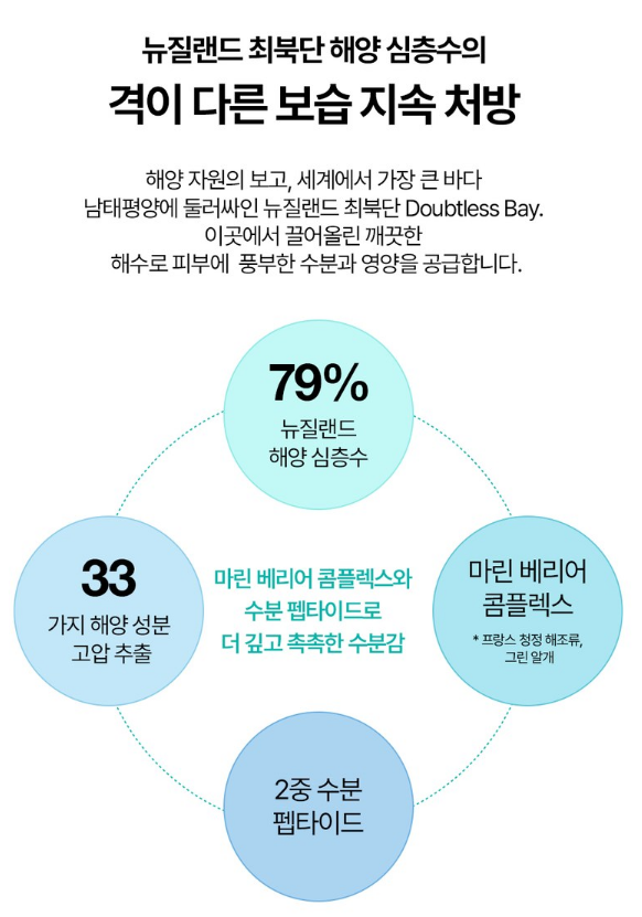 뉴질랜드 해양 심층수 79%, 마린 베리어 콤플렉스, 2중 수분 펩타이드, 33가지 해양 성분 고압 추출로 더 깊고 촉촉한 수분감을 느낄 수 있어요.