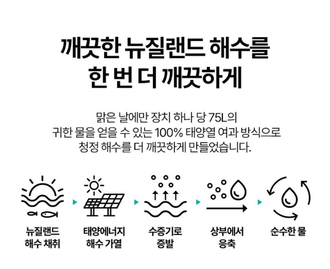 맑은 날에만 장치 하나 당 75L의 귀한 물을 얻을 수 있는 100% 태양열 여과 방식으로 청정 해수를 더 깨끗하게 만들었어요.