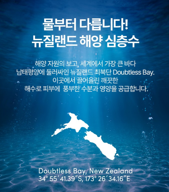 해양 자원의 보고, 세계에서 가장 큰 바다 남태평양에 둘러싸인 뉴질랜드 최북단 Doubtless Bay에서 끌어올린 깨끗한 해수로 피부에 풍부한 수분과 영양을 공급해요.