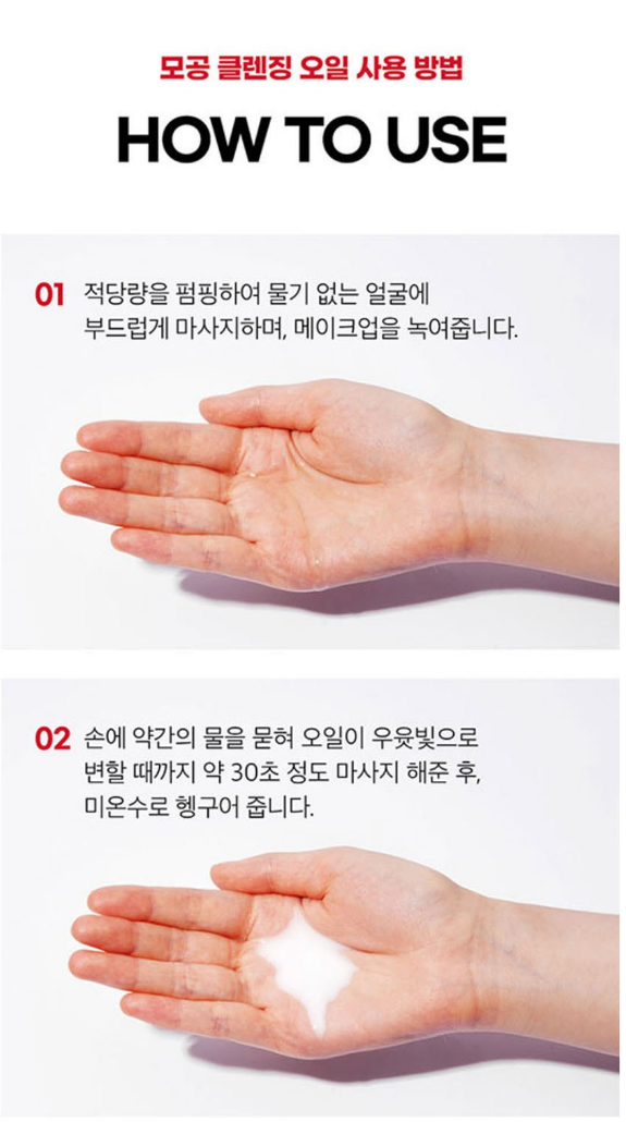먼저 적당량을 펌핑하여 물기 없는 얼굴에 부드럽게 마사지하며 메이크업을 녹여주세요. 손에 약간 물을 묻혀 오일이 우윳빛으로 변할 때까지 약 30초 정도 마사지 해준 후, 미온수로 헹궈주세요.