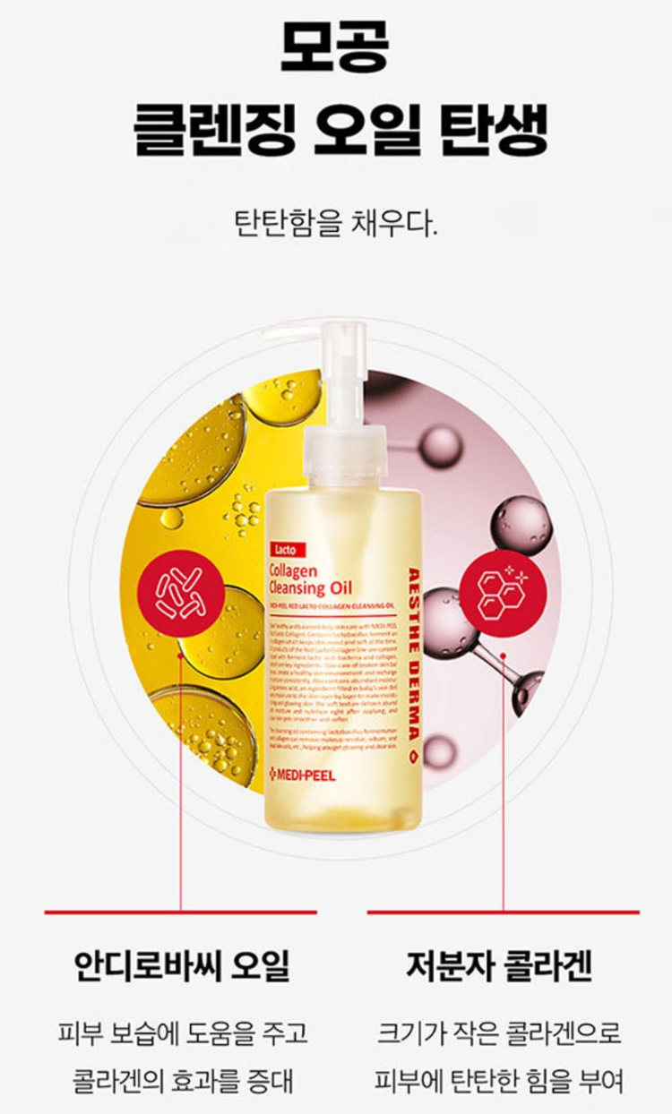 메디필 클렌징 오일은 피부 보습에 도움을 주고 콜라겐 효과를 증대시키는 안디로바씨 오일이 함유되어 있어요. 또한 크기가 작은 콜라겐 함유로 피부에 탄탄한 힘을 부여해요.