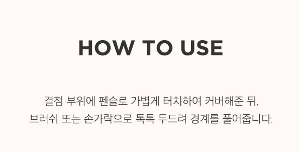 결점 부위에 펜슬로 가볍게 터치하여 커버해준 뒤, 브러쉬 또는 손가락으로 톡톡 두드려 경계를 풀어주세요!