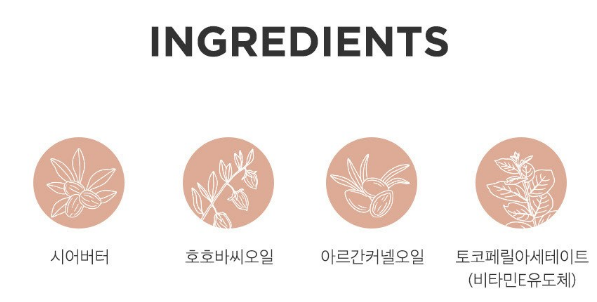 시어버터, 호호바씨오일, 아르간커넬오일, 토코페릴아세테이트 등 식물성 성분이 들어가 있어 안심할 수 있어요!