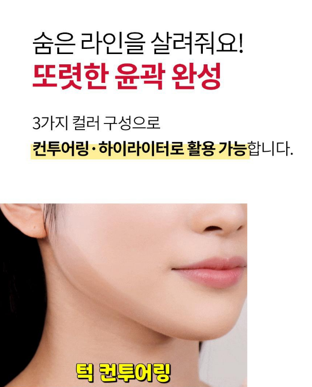 3가지 컬러 구성으로 컨투어링과 하이라이터로도 활용 가능하면서 또렷한 윤곽라인을 만들어줘요.