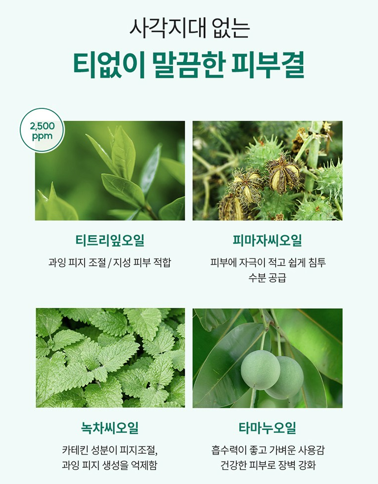 티트리잎 오일, 피마자씨 오일, 녹차씨 오일의 함유로 피지조절을 해주고, 피부에 수분을 공급해줘요. 또한 타마누 오일 함유로 흡수력이 좋고 가벼운 사용감을 선사하고, 건강한 피부로 장벽을 강화해줘요.