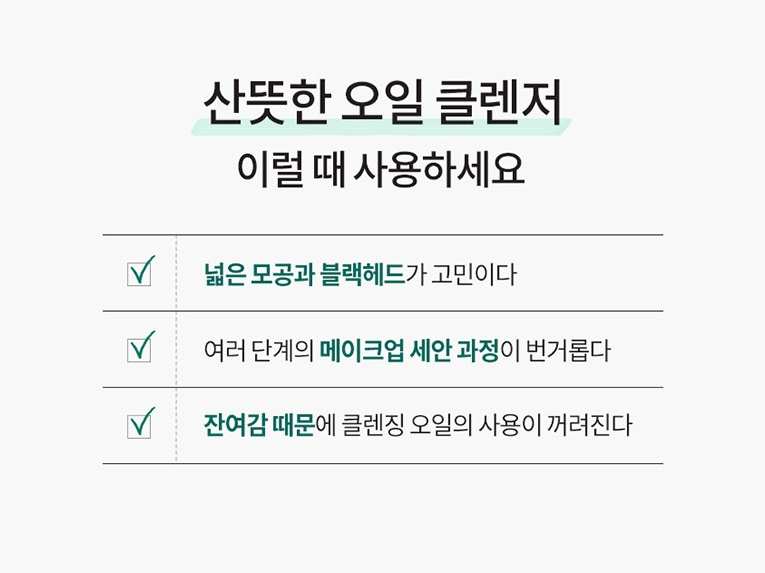 그래서 오늘은 여드름 피부가 고민이신 분들이 사용하기 좋은 순한 성분과 유분감은 덜고 산뜻한 마무리감을 갖춘 여드름 피부 클렌징 오일을 소개해드릴게요. 그럼 지금부터 집중해서 봐주세요. ^^