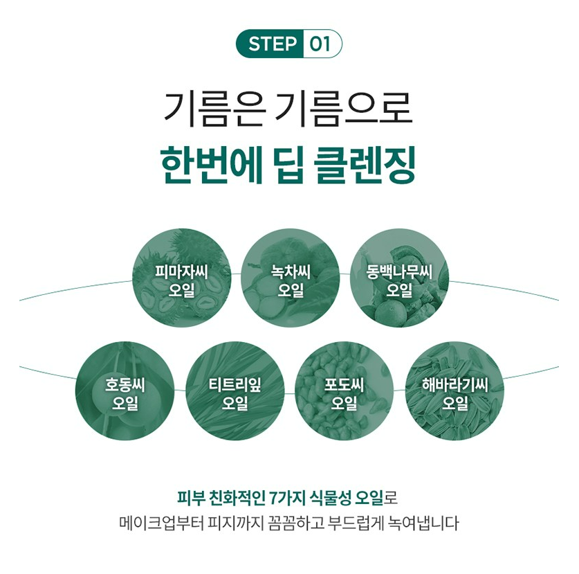 피부 친화적인 7가지 식물성 오일로 메이크업부터 피지까지 꼼꼼하고 부드럽게 녹여내줘요.