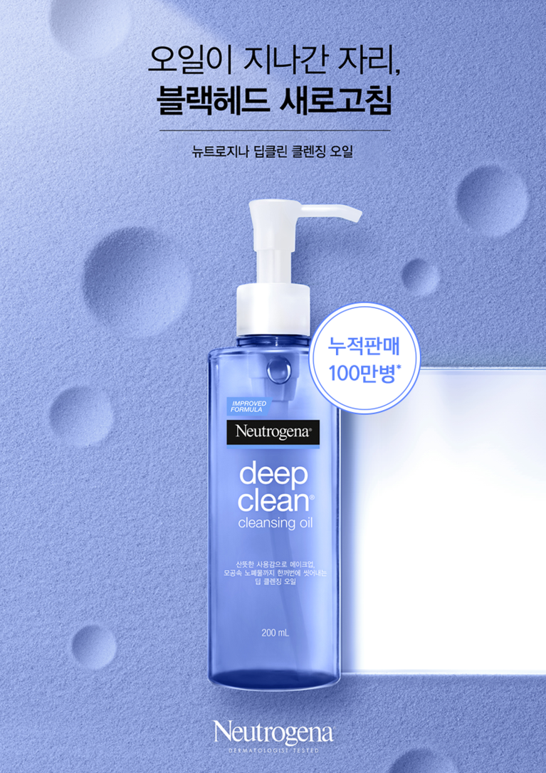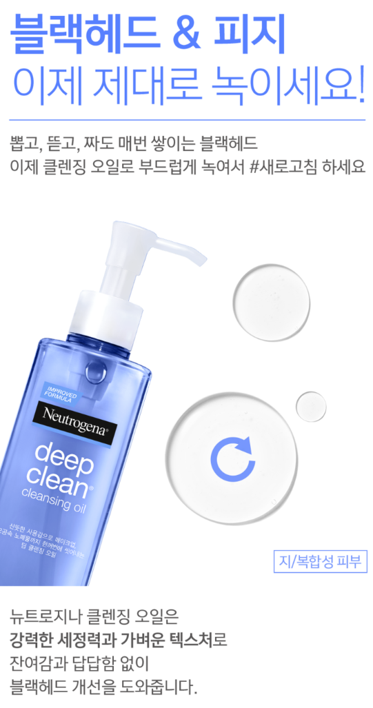 뉴트로지나 클렌징 오일은 강력한 세정력과 가벼운 텍스처로 잔여감과 답답함 없이 블랙헤드 개선을 도와줘요.