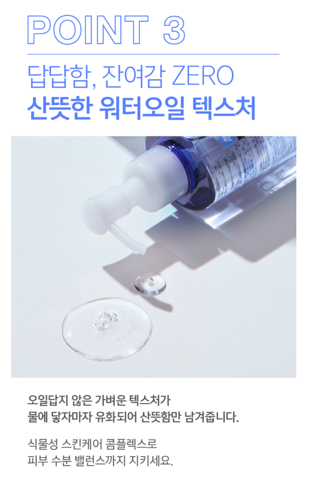 오일답지 않은 가벼운 텍스처가 물에 닿자마자 유화되어 산뜻함을 준답니다. 식물성 스킨케어 콤플렉스로 피부 수분 밸런스를 지킬 수 있어요.