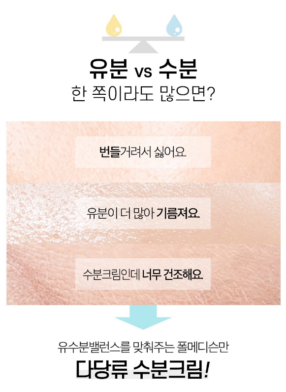 유분과 수분 한 쪽이라도 많아 번들거려서 싫거나 유분이 더 많아 기름지게 느껴지거나, 수분크림인데 너무 건조하다 느끼시는 분들. 유수분밸런스를 맞춰주는 폴메디슨의 다당류 수분크림을 사용해보세요!