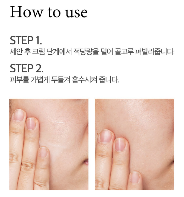 세안 후 크림 단계에서 적당량을 덜어 골고루 펴발라주고 피부를 가볍게 두들겨 흡수 시켜주면돼요!