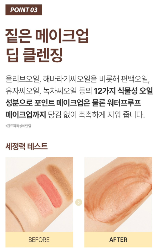 올리브 오일, 해바라기씨 오일을 비롯해 편백 오일, 유자씨 오일, 녹차씨 오일 등의 12가지 식물성 오일 성분으로 포인트 메이크업은 물론 워터프루프 메이크업까지 당김 없이 촉촉하게 지워준답니다.