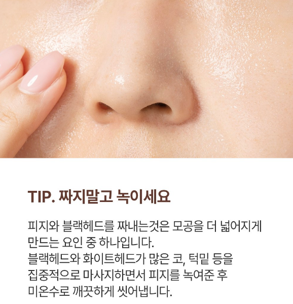 피지나 블랙헤드를 짜내는 것은 모공을 더 넓어지게 만드는 요인 중 하나예요. 블랙헤드와 화이트헤드가 많은 코, 턱밑 등을 집중적으로 마사지하면서 피지를 녹여준 후 미온수로 깨끗하게 씻어내주세요.
