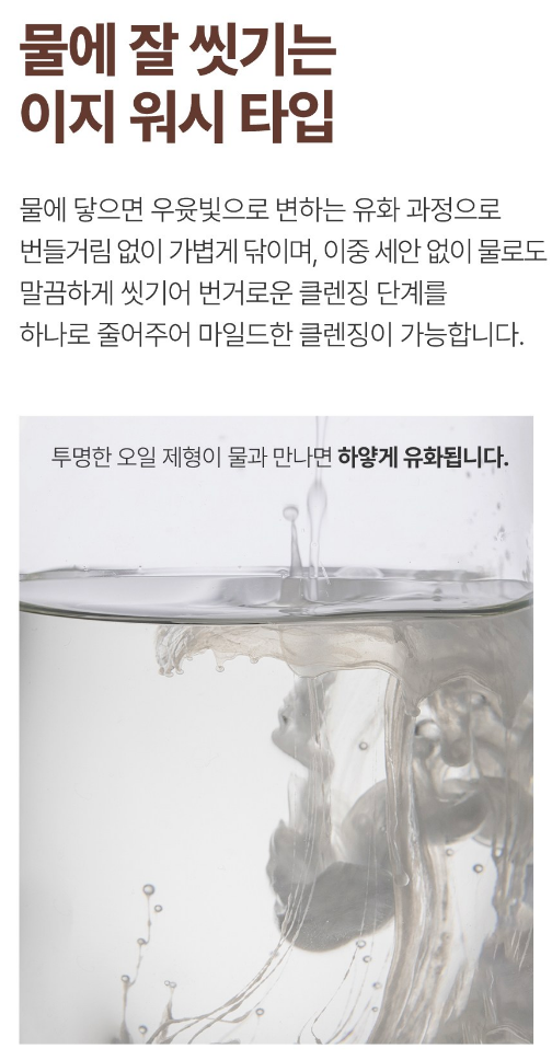 물에 닿으면 우윳빛으로 변하는 유화 과정으로 번들거림 없이 가볍게 닦이며, 이중 세안 없이 물로도 말끔하게 씻겨 번거로운 클렌징 단계를 하나로 줄어주어 마일드한 클렌징이 가능해요.