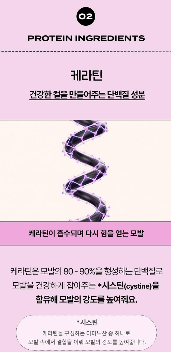 케라틴은 모발의 80-90%을 형성하는 단백질로 모발을 건강하게 잡아주는 시스틴을 함유해 모발의 강도를 높여줘요.