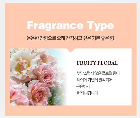 부담스럽지 않은 플로럴 향이 헤어에 가볍게 밀착되어 은은하게 퍼져 나가요.