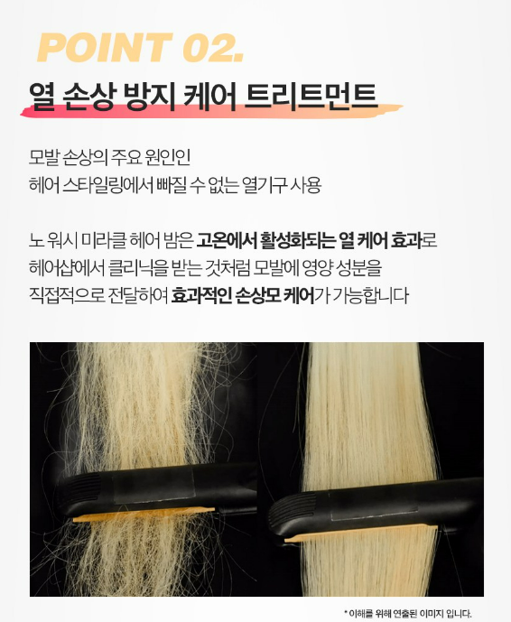 노워시 미라클 헤어밤은 고온에서 활성화 되는 열 케어 효과로 헤어샵에서 클리닉을 받은 것처럼 모발에 영양 성분을 직접적으로 전달하여 효과적인 손상모 케어가 가능해요.