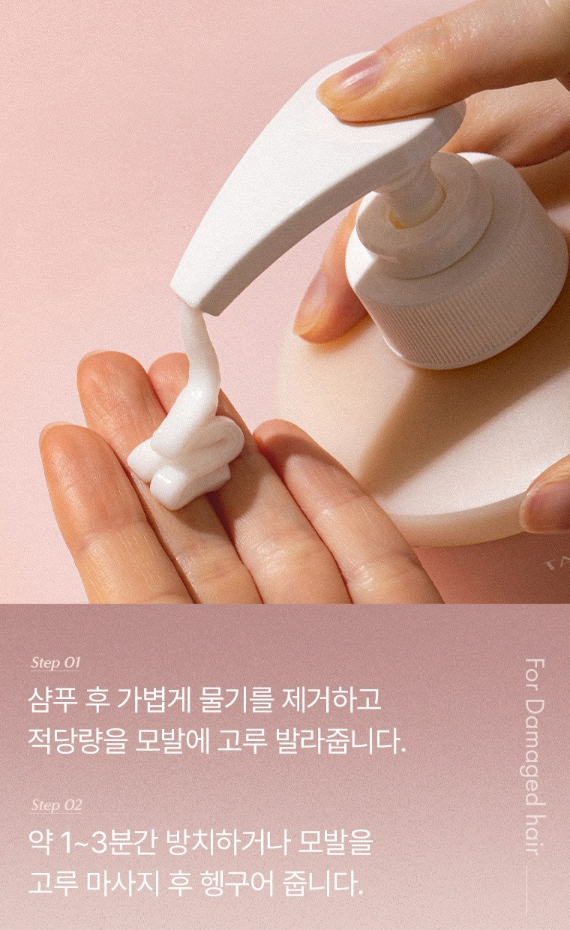 샴푸 후 가볍게 물기를 제거하고 적당량을 모발에 골고루 발라주세요. 그 다음 약 1~3분간 방치하거나 모발을 고루 마사지 후 헹궈내 주세요.
