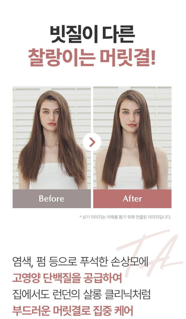 탱글엔젤 헤어 트리트먼트는 염색, 펌 등으로 푸석한 손상모에 고영양 단백질을 공급하여 집에서도 런던의 살롱 클리닉처럼 부드러운 머릿결로 집중 케어가 가능해요.