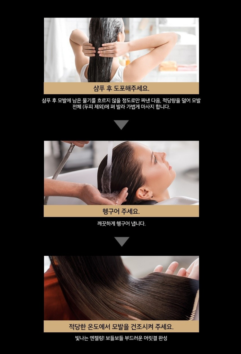샴푸 후 모발의 물기를 짜낸 다음, 적당량을 덜어 모발 전체에 펴 발라 가볍게 마사지해주세요. 그 다음 깨끗하게 헹구어 낸 후 적당한 온도에서 모발을 건조시켜 주세요.