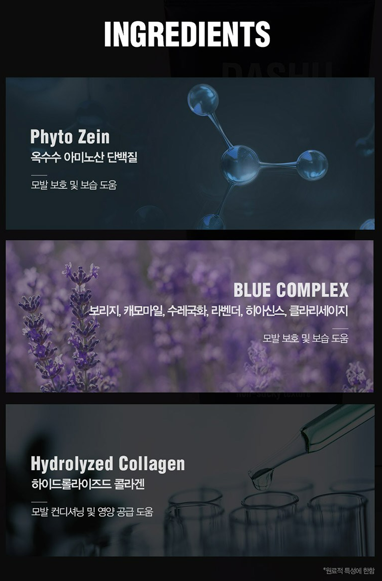 옥수수 아미노산 단백질, 블루 컴플렉스, 하이드롤라이즈드 콜라겐 성분이 모발 보호 및 보습에 도움을 주고 모발 컨디셔닝 및 영양 공급에도 도움을 줘요.