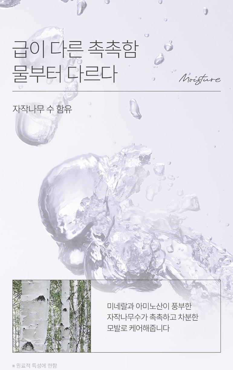 미네랄과 아미노산이 풍부한 자작나무수가 촉촉하고 차분한 모발로 케어해줘요.