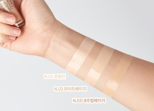 3가지 색상 피부 발색샷이에요. 포슬린은 밝고 화사한 색상, 라이트베이지는 밝으면서 자연스러운 색상, 내추럴베이지는 조금 어두운 느낌의 색상인 것을 보실 수 있어요!