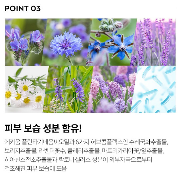 에키움 플란타기네움씨오일과 6가지 허브콤플렉스(수레국화추출물, 보리지추출물, 라벤더꽃수, 클레리추출물, 마트리카리아꽃/잎추출물, 히아신스전초추출물)과 락토바실러스 성분이 외부자극으로부터 건조해진 피부 보습에 도움을 줘요.