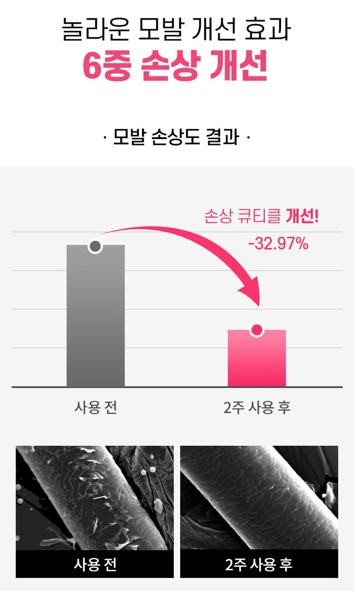 6중 모발 손상 개선 임상을 완료한 제품으로 모발 손상 올케어가 가능한 제품이에요.