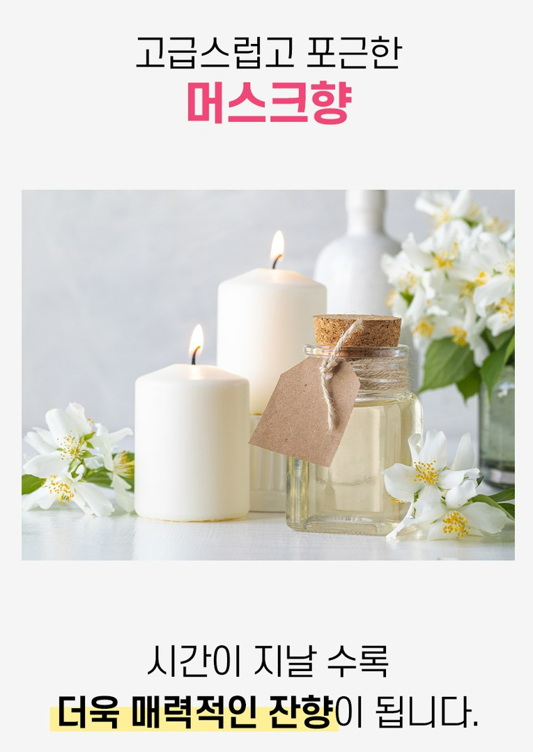 고급스럽고 포근한 머스크 향이 시간이 지날수록 더욱 매력적인 잔향이 돼요.