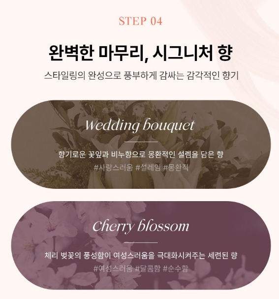 향기로운 꽃잎과 비누향의 웨딩부케 향과 체리 벚꽃향의 체리 블라썸 두가지 향으로 구성되어 있어요.