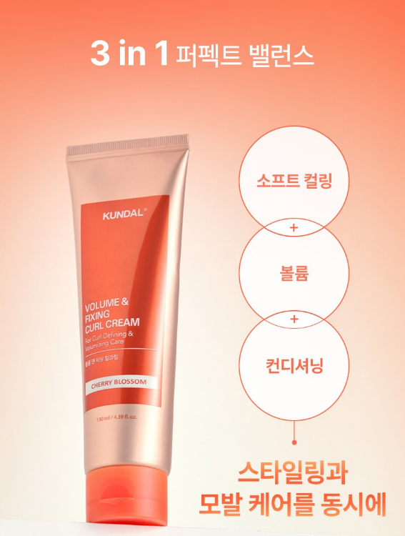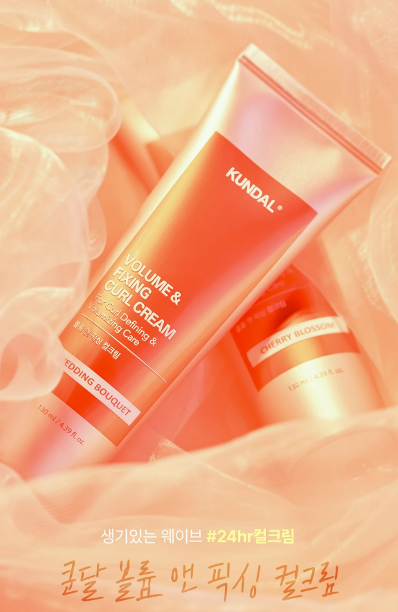 쿤달의 볼륨 픽싱 컬크림은 소프트 컬링, 볼륨, 컨디셔닝까지 다 잡아 스타일링과 모발 케어를 동시에 할 수 있는 제품이에요.