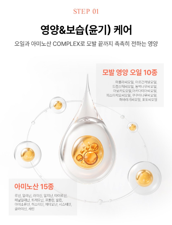 모발 영양 오일 10종과 아미노산 15종 콤플렉스로 모발 끝까지 촉촉히 영양을 전달해줘요.