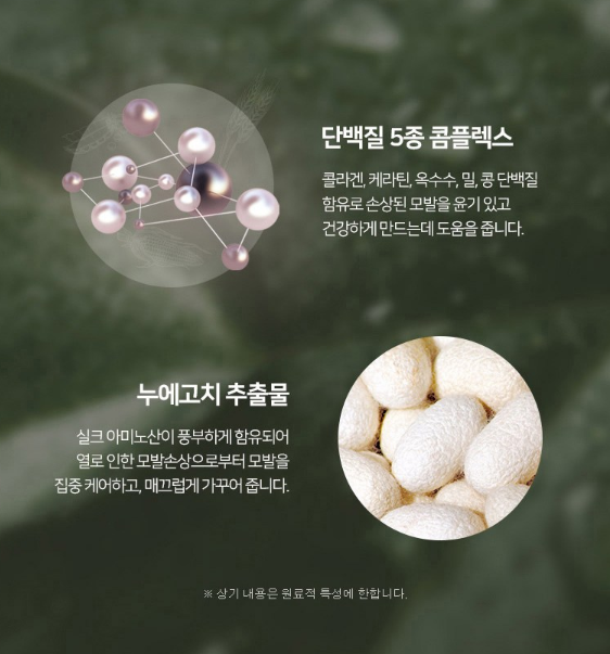 손상된 모발을 윤기있게 만들어주고 건강하게 해주는 단백질 5종 콤플렉스와 누에고치 추출물을 포함하고 있어요.