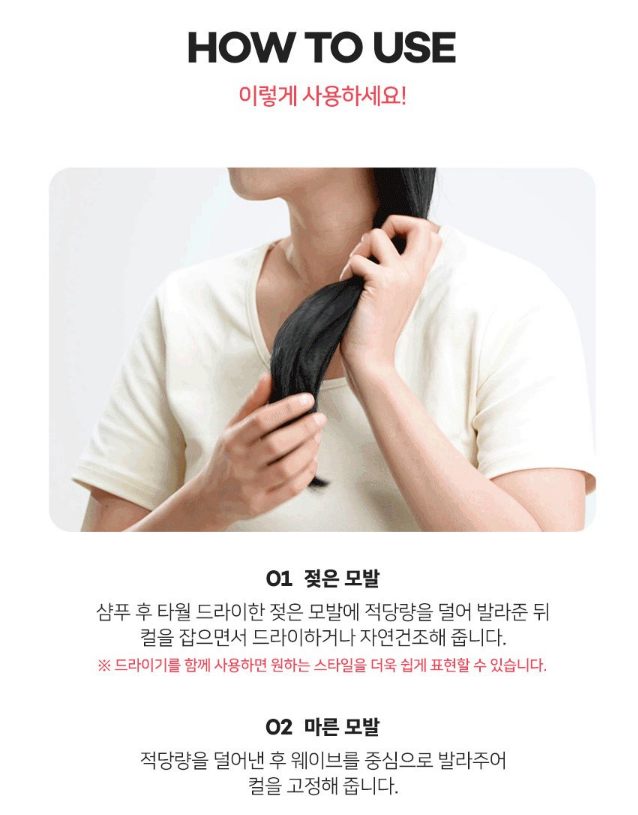 젖은 모발의 경우, 샴푸 후 타월 드라이한 젖은 모발에 적당량을 덜어 발라준 뒤 컬을 잡으면서 드라이 하거나 자연 건조해주세요. 마른 모발의 경우, 적당량을 덜어낸 후 웨이브 중심으로 발라주어 컬을 고정해주세요.