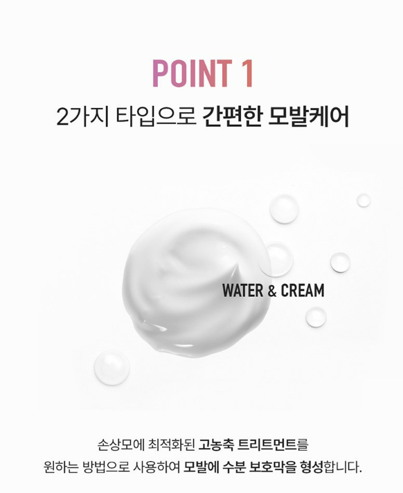 멀리서 분사하여 미스트 형태로 전체적인 머릿결 케어도 가능하고, 가까이 분사하여 고농축 크림으로 손상모 케어도 가능해요.