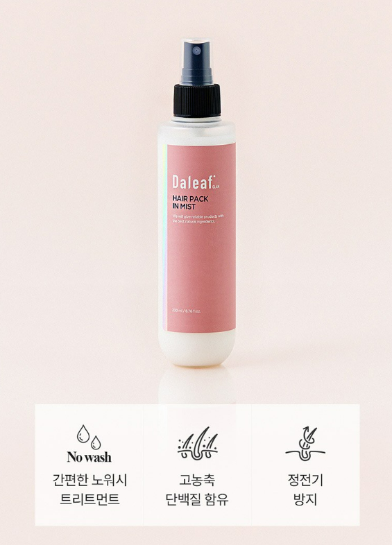 달리프 헤어 팩 인 미스트는 간편한 노워시 트리트먼트, 고농축 단백질 함유, 정전기 방지가 가장 큰 3가지 특징이에요.