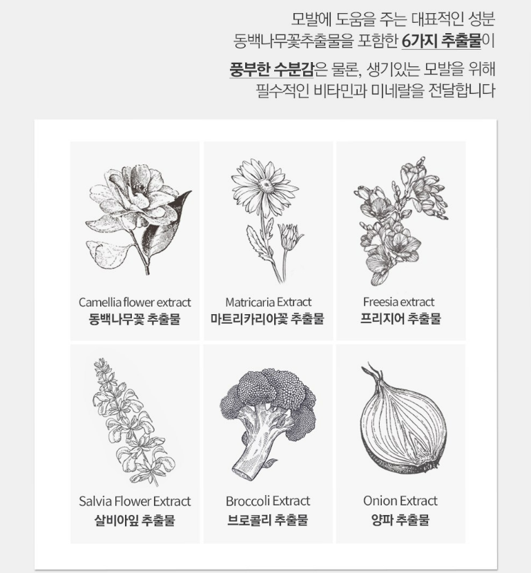 모발에 도움을 주는 대표적인 성분 동백나무꽃추출물을 포함한 6가지 추출물이 풍부한 수분감은 물론 생기 있는 모발을 위해 필수적인 비타민과 미네라를 전달해요.