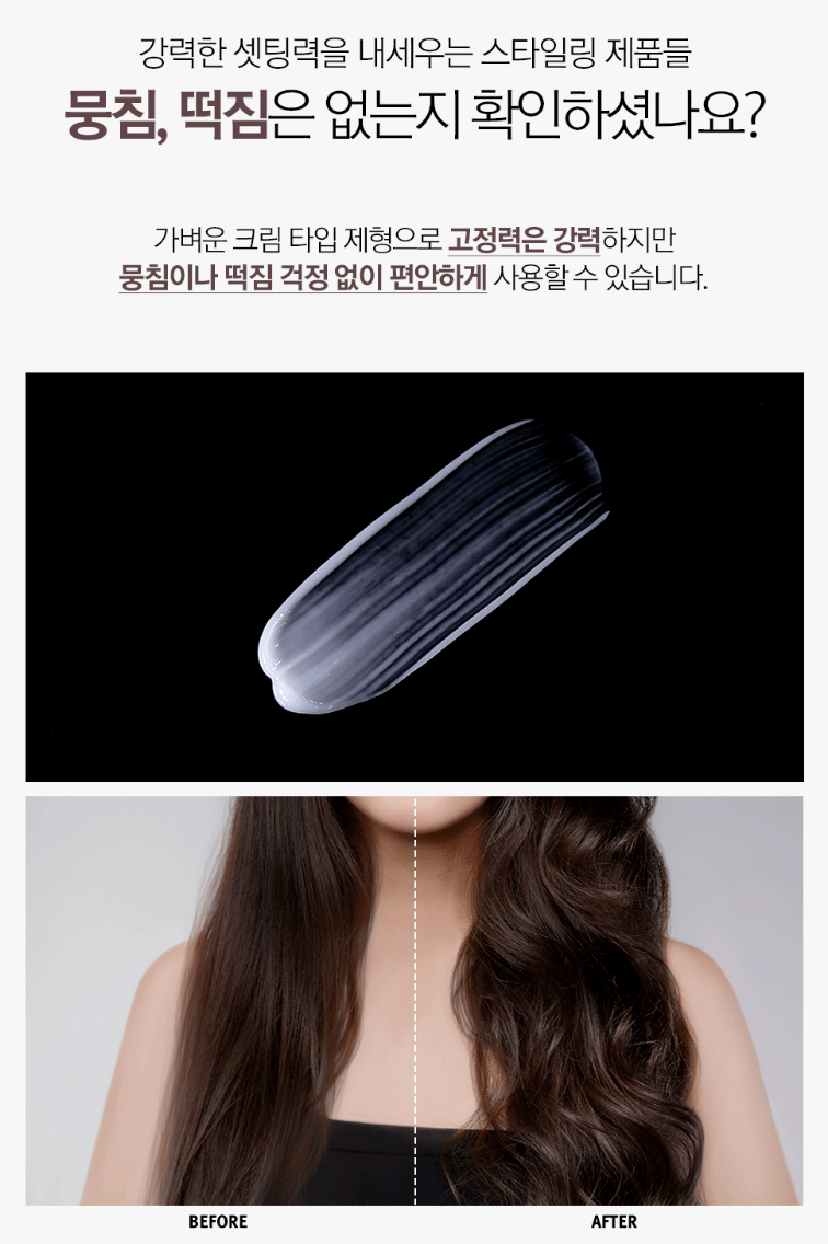 발림성이 부드러워서 컬크림 사용이 익숙하지 않으신 분들도 쉽게 사용할 수 있어요. 또 부드러운 발림성을 가진 제형이라 뭉침이 덜하다는 장점이 있어요.