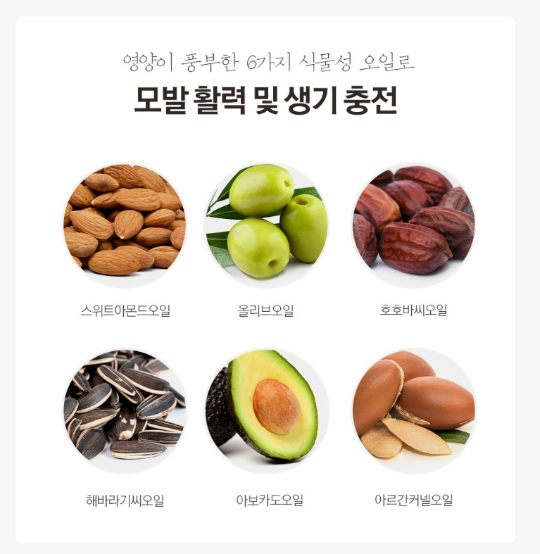 스위트아몬드오일, 올리브오일, 호호바씨오일, 해바라기씨오일, 아보카도오일, 아르간커넬오일 영양이 풍부한 6가지 식물성 오일로 모발 활력 및 생기 충전에 도움이 돼요.