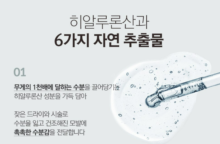 무게의 1천배에 달하는 수분을 끌어당기는 히알루론산 성분을 가득 담아 잦은 드라이와 시술로 수분을 잃고 건조해진 모발에 촉촉한 수분감을 전달해요.