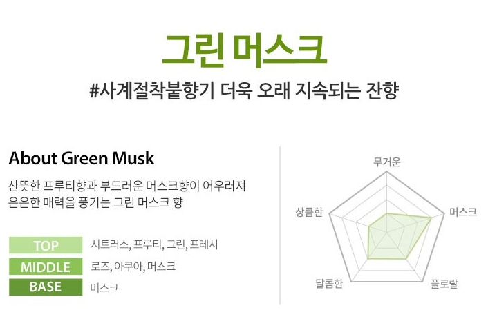 산뜻한 프루티향과 부드러운 머스크향이 어우러져 은은한 매력을 풍기는 그린 머스크 향을 느껴보실 수 있어요.