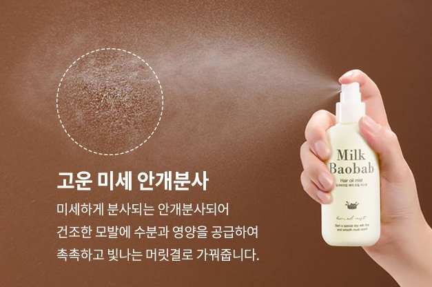 밀크바오밥 헤어 미스트는 촉촉한 수분 공급 및 산뜻한 사용감과 풍부한 영양 공급 및 수분증발방지 모발 코팅의 미스트와 오일의 2가지 장점을 모두 담아냈어요.