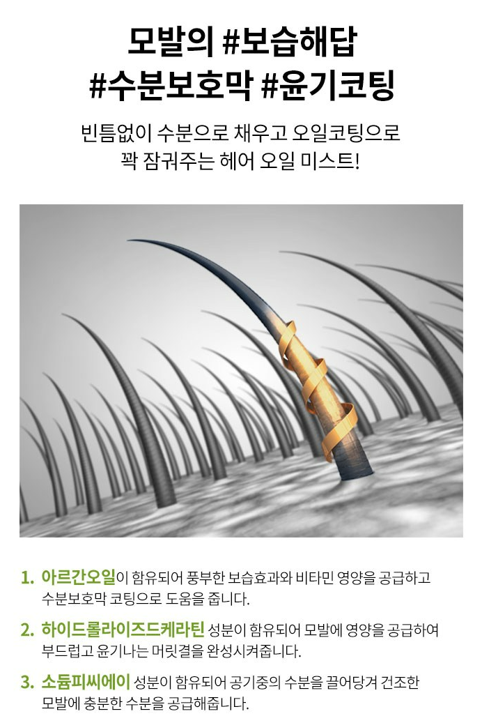 아르간 오일 함유되어 있어 아르간 오일의 비타민 E 성분이 모발 보습에 도움을 줘요.